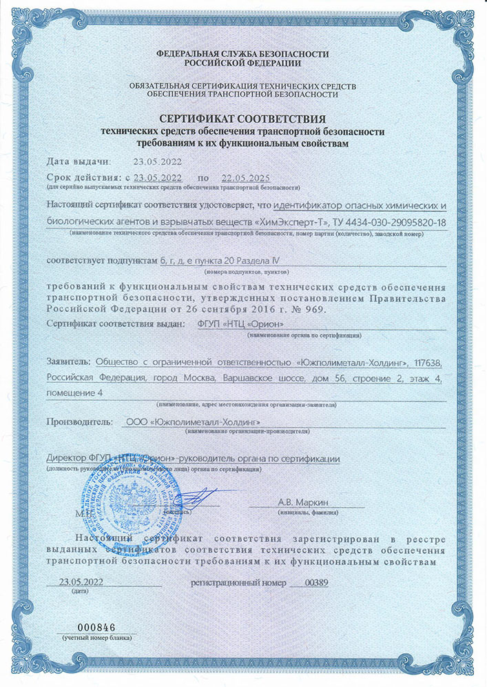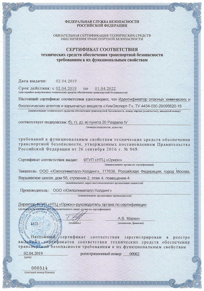 (Сертификат соответствия №62 от 02.04.2019, Сертификат соответствия №389 от 23.05.2022).